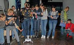 La partie guidée a tourné essentiellement sur le plateau astronomie d'Explora, avec une découverte des Muons (photo ci-dessus, le groupe autour du détecteur), les mesures de distance du mètre à l'année lumière, la distance des étoiles, et, plus terre à terre, la différence entre la masse et le poids, notre poids sur la Lune et sur Mars, etc.